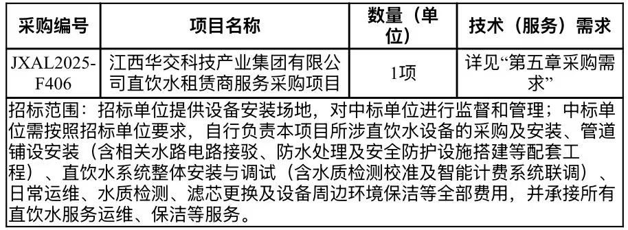 项目名称:江西华交科技产业集团有限公司直饮水租赁商服务采购项目