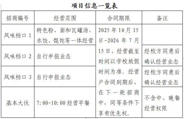 本次招商聚焦东风园餐厅一楼4个风味档口,单个档口面积50-60㎡,经营范围需符合高校食堂经营规范。